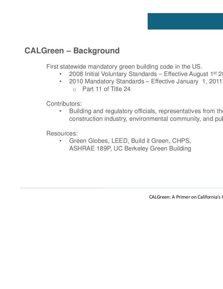 CALGreen: A Primer on California's Green Building Code from image.slidesharecdn.com California's building standards commission (bsc) unanimously adopted the united states' first statewide green building code. .green building standards code (calgreen code) is part 11 of the california building standards code and is the first statewide green building code the purpose of calgreen is to improve public health, safety and general welfare by enhancing the design and construction of buildings through the. California building standards code changes to take effect on january 1, 2020. The california green building standards code (calgreen code) is part 11 of the california building standards code and is the first statewide green building code in the us. Below are 49 working coupons for california green building code from reliable websites that we have updated for users to get maximum savings. On an annualized basis, a zero net energy building consumes as much energy as it generates through a renewable energy system. The most common way to update promo code from our site is. To measure voc content in waterborne coatings more accurately, jones and his colleagues at cal poly developed a technique based on gas chromatography, with which compounds in a paint sample can be separated according to their boiling points.